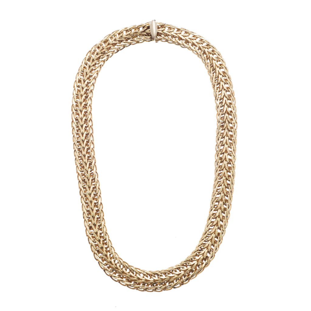 composed of a broad band of fancy interlocking links, with concealed clasp and safety clip, stamped BREV 750