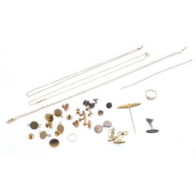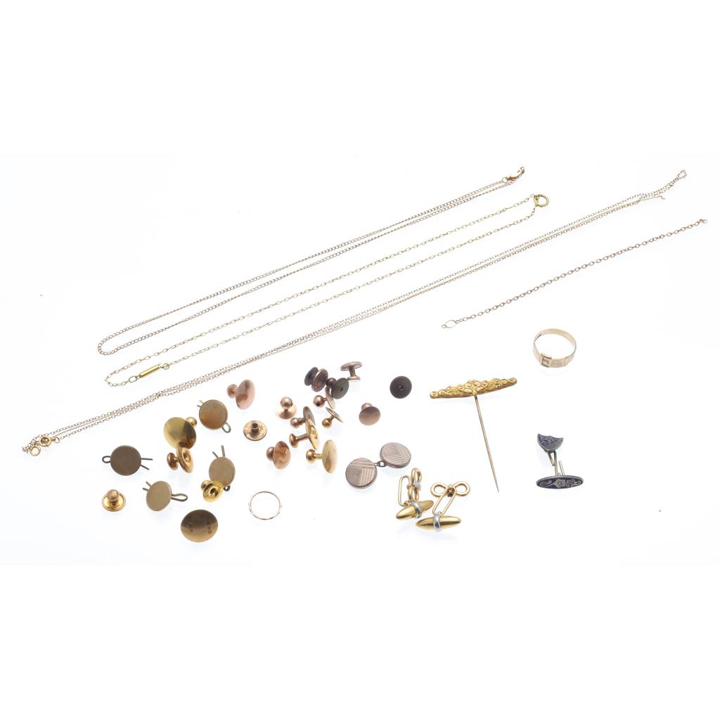 to include a set of four 9ct gold engine turned buttons, various 9ct gold studs; three 18ct gold studs and a variety of various unmarked yellow metal cufflinks, studs and chains (qty)