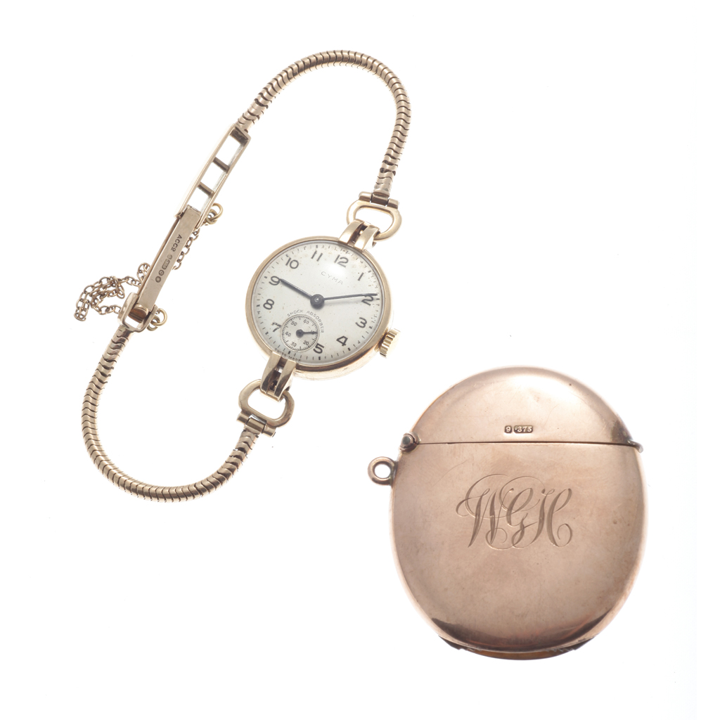 with hinged lid and engraved initials to front; together with a lady's 9ct gold Cyma wrist watch (2)