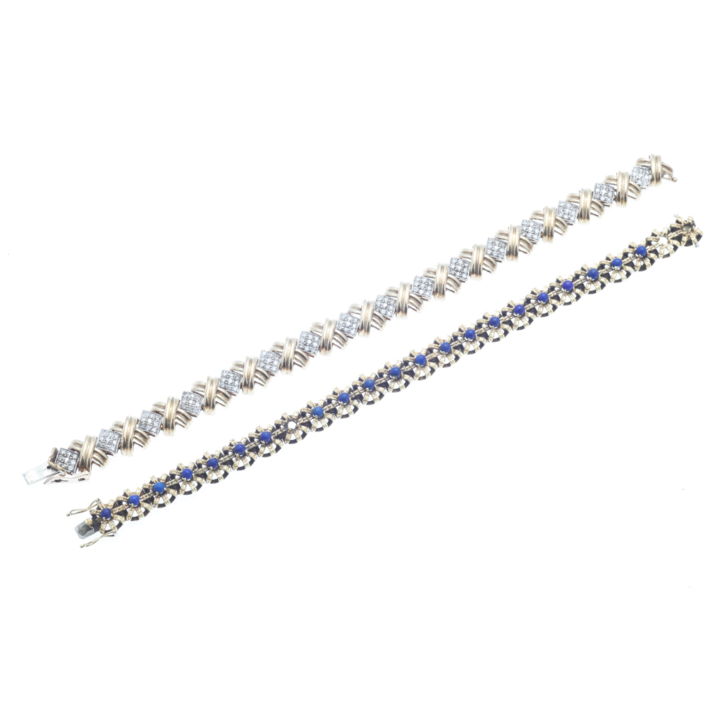 to include an 18ct gold and lapis lazuli set bracelet composed of floral cluster links; a 9ct gold and diamond set bracelet (2)