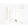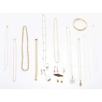 to include a pair of amethyst set pendant earrings and matching pendant, stamped 375, a ropetwist necklace stamped 575; a pearl set ring stamped 9ct, two yellow metal and cultured pearl necklaces, unmarked; five necklaces stamped 9ct or 375; a 9ct bracelet and bangle, Victorian 9ct brooch and other items (qty)