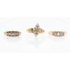 the navette cluster set with a small round cut diamond and half pearls, to a plain 18ct gold shank with scrolling detail to shoulders; together with two 18ct gold five stone diamond set rings (3)