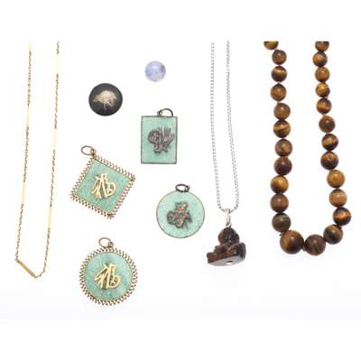to include a single strand of tiger's-eye beads, a carved tigers-eye Buddha pendant; four jade set pendants with onset Chinese character detail, a loose star sapphire cabochon, a fancy link chain stamped 22k (qty)