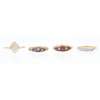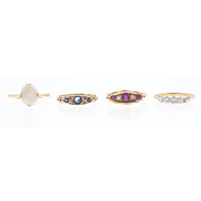 to include a five stone diamond set ring, an eighteen carat gold diamond and ruby set ring; an eighteen carat gold diamond and sapphire set ring, an opal set ring (4)
