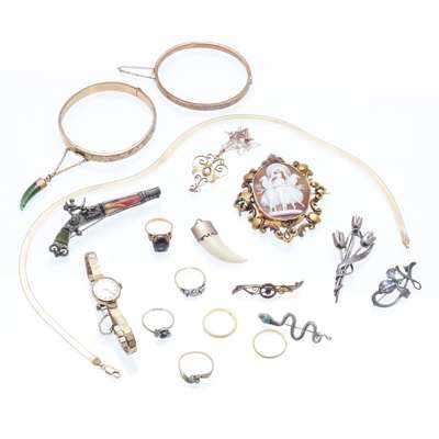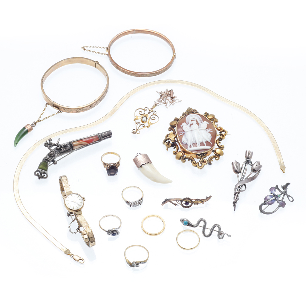 to include a 9ct gold bangle with hardstone pendant, and another unmarked; a 9ct gold flattened link necklace, a two stone diamond ring, a smokey quartz set ring, a sapphire and diamond set ring; a aquamarine and seed pearl set pendant; various other brooches, rings and wrist watches (qty)