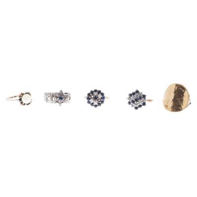 to include a 9ct gold sapphire and opal set cluster ring, a sapphire and diamond set cluster ring to a textured white metal band, an 18ct gold sapphire and diamond set cluster ring, a pearl set ring, a 1902 half sovereign set ring (5)