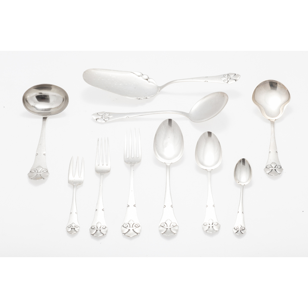 comprising; nine serving pieces, six table forks, five table spoons; six dessert spoons, six dessert forks, six pastry forks, five odd small spoons, the terminals single struck with stylised fleur di lys motif