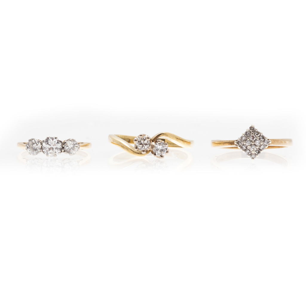 to include a 18ct two stone diamond set ring, a three stone diamond set ring, to a plain unmarked yellow metal shank; a 9ct gold set diamond cluster ring (3)