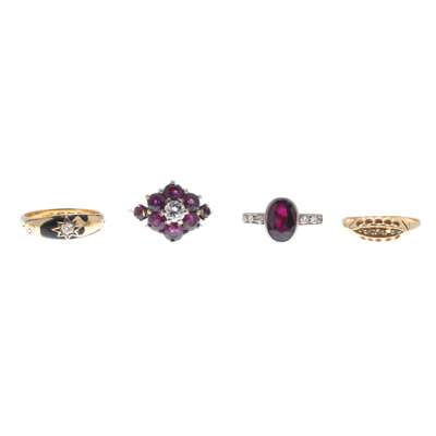 claw set with a circular diamond, in a border of round cut synthetic rubies, to a plain shank stamped 18ct; together with a garnet and diamond set ring and two further 18ct gold and diamond set rings (4)