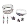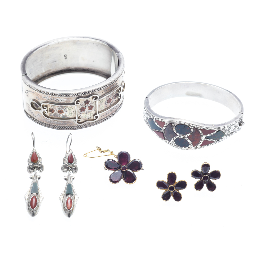 of hinged design, set with various hardstones and engraved detail; together with another silver bangle with floral detail; a pair of hardstone set earrings and a Victorian paste set brooch and earrings (5)