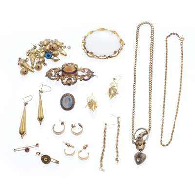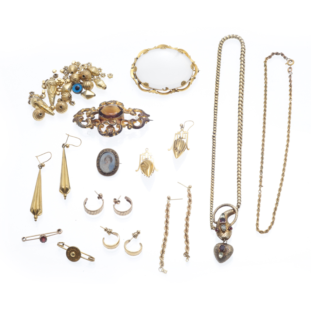 to include a gem set necklace modelled as a snake suspending a heart pendant with glazed panel to rear; two pairs of pendant earrings; two large gem set brooches; three small brooches; three pairs of earrings, a chain and a collection of untested yellow metal beads (qty)