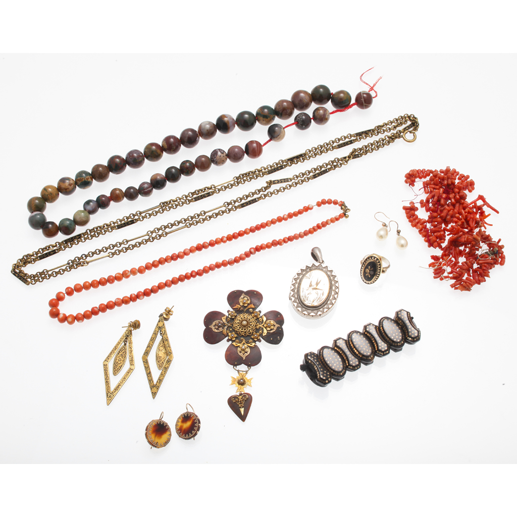 to include a slightly graduated coral bead necklace and another, a graduated strand of hardstone beads; a pair of faux pearl pendant earrings; various pieces of tortoiseshell pique work; a locket, yellow metal and enamel pendant earrings and a similar style muff chain (qty)