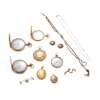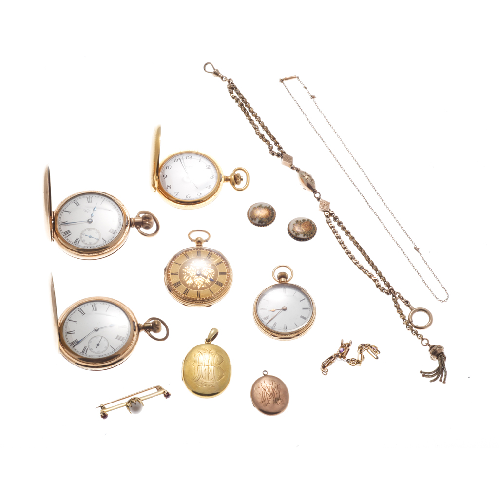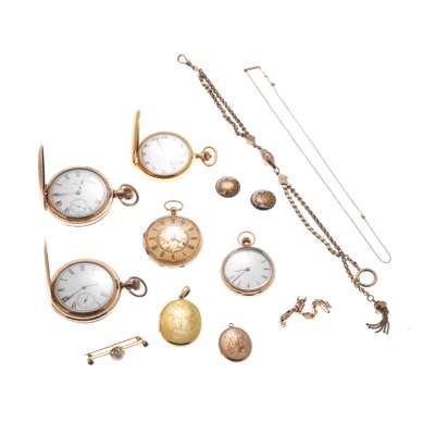 to include a mid 19th century 18ct gold cased pocket watch, fully engraved case, keyless wind three quarter plate lever movement, gilt dial, black Arabic numerals; another smaller, similar style, white dial; three rolled gold pocket watches; a fancy link lady's Albert with central large beads and tassel drops, marked 9ct; two 9ct lockets, one engraved with crest and motto; two small Satsuma buttons and a bar brooch set central bouton pearl, (not tested) gem set terminals (qty)