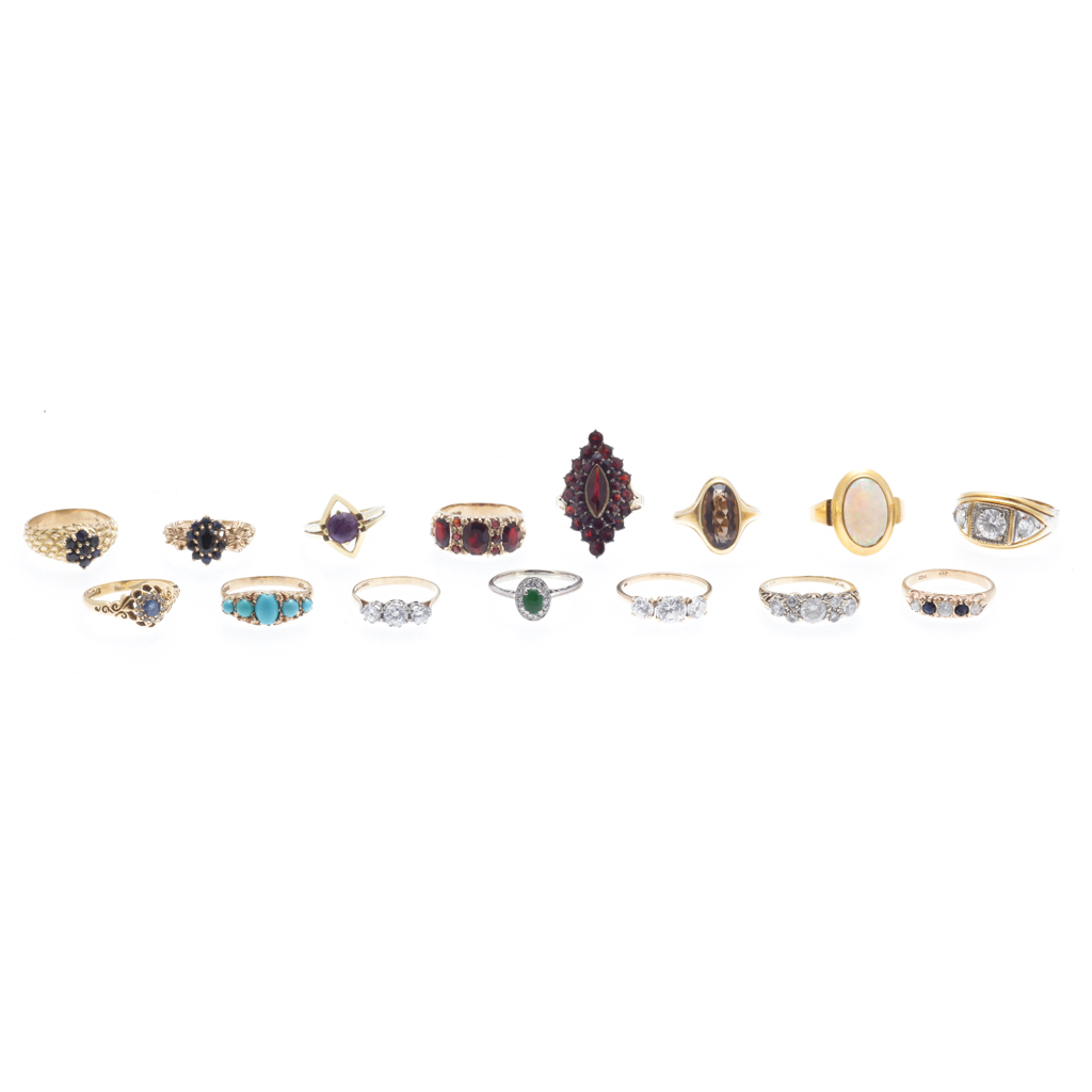 to include two garnet set rings, a 9ct gold turquoise set ring; a single stone amethyst set ring, a citrine set ring an oval opal set ring, two sapphire set rings; various other sapphire paste and gem set rings (15)