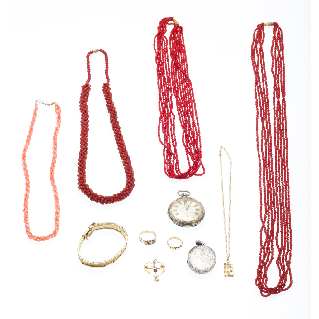to include various coral bead necklaces, a garnet set heart shaped pedant, a 9ct gold ring and another gem set ring; a silver locket, a silver cased pocket watch, a Christian Dior costume bracelet; a yellow metal abacus pendant (qty)