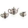 with character mark to base, comprising teapot, milk jug, two handled sugar bowl with lid, of spherical outline with applied floral decoration, bamboo handles, spout and finial (3)