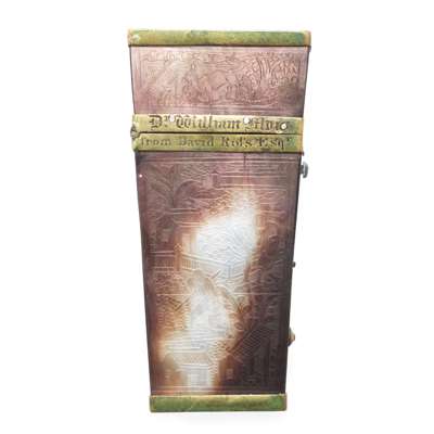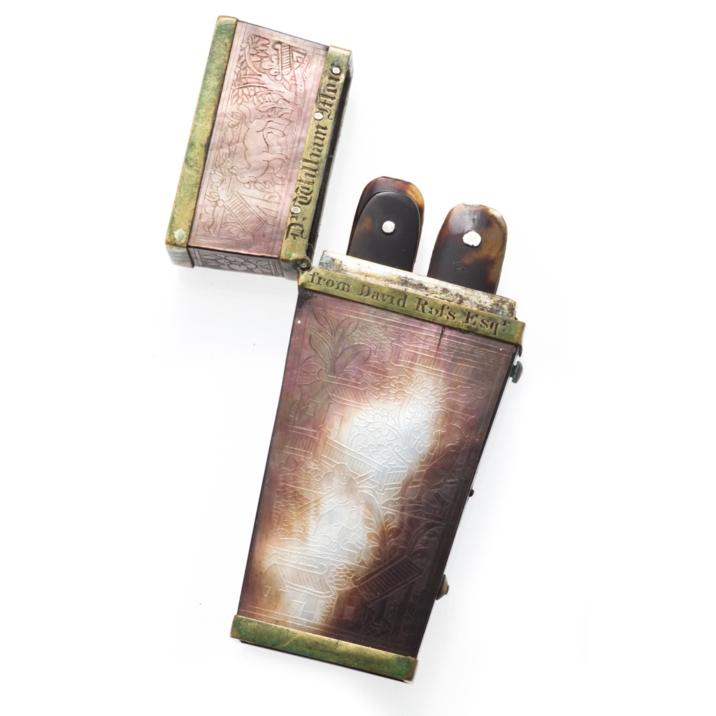 for four tortoiseshell mounted surgeon's blades, the brass mounts plain and engraved 'Dr William Muir, from David Rofs Esq, Calcutta, 15th August 1837' the body of the case of delicately carved mother of pearl, with Chinoiserie scenes, the fitted interior with four knives