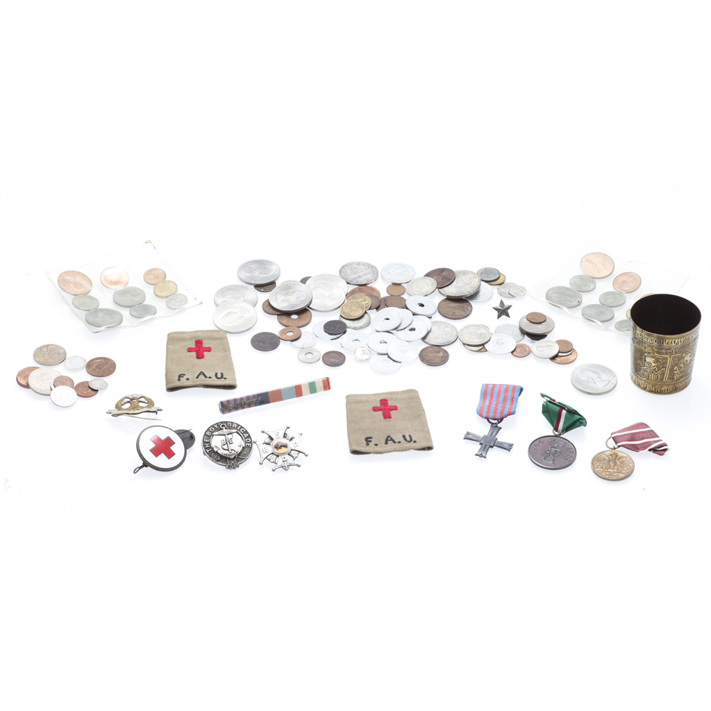 to include; group of WWII medals, various other medals, Polish etc., military badges, metal, sewn and plastic, coins include all world, GB silver noted, various denominations, a large quantity