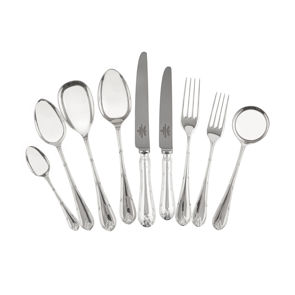 Mappin and Webb, Sheffield 1995, comprising eight table knives, eight dessert knives, eight soup spoons, eight dessert forks, eight table forks, two serving spoons, one pair of salad spoons, eight dessert spoons, eight teaspoons in original Mappin & Webb box with key (52)