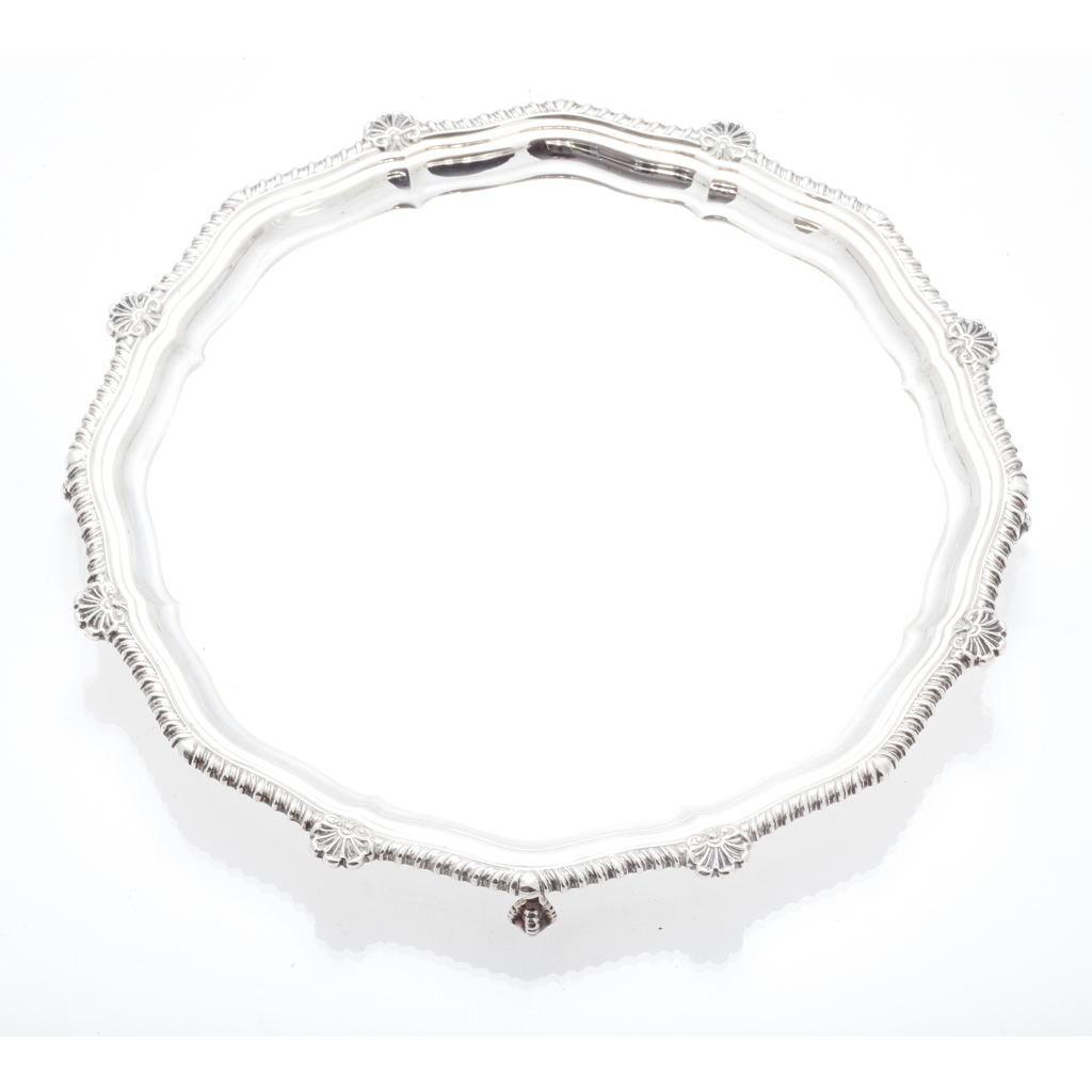 Cooper Brothers & Sons Ltd, Sheffield 1965, of shaped circular outline with everted gadrooned border and shell detail, raised on four claw feet