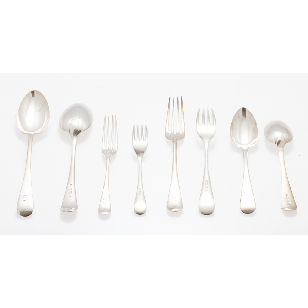 of Old English pattern comprising; twelve dessert forks marked for Viner's Ltd, Sheffield 1960, twelve table forks, twelve table spoons both Joseph Rodgers & Sons 1904, twelve dessert spoons possibly William London, London 1825 (48)