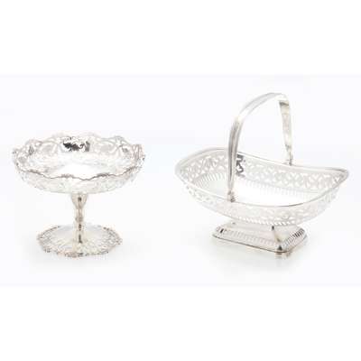 S Blanckensee & Sons Ltd, Birmingham 1938, raised on a wide foot with pierced gallery, swing handle, together with a pierced foliate decorated tazza, D.F., London 1903; quantity of cased teaspoons, a pair of cased salad servers (qty)