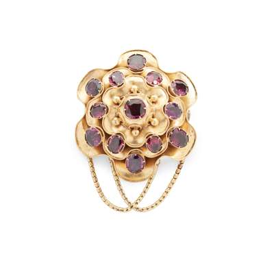 of circular outline, set throughout with various oval and cushion-cut garnets, with a double chain pendant, unmarked