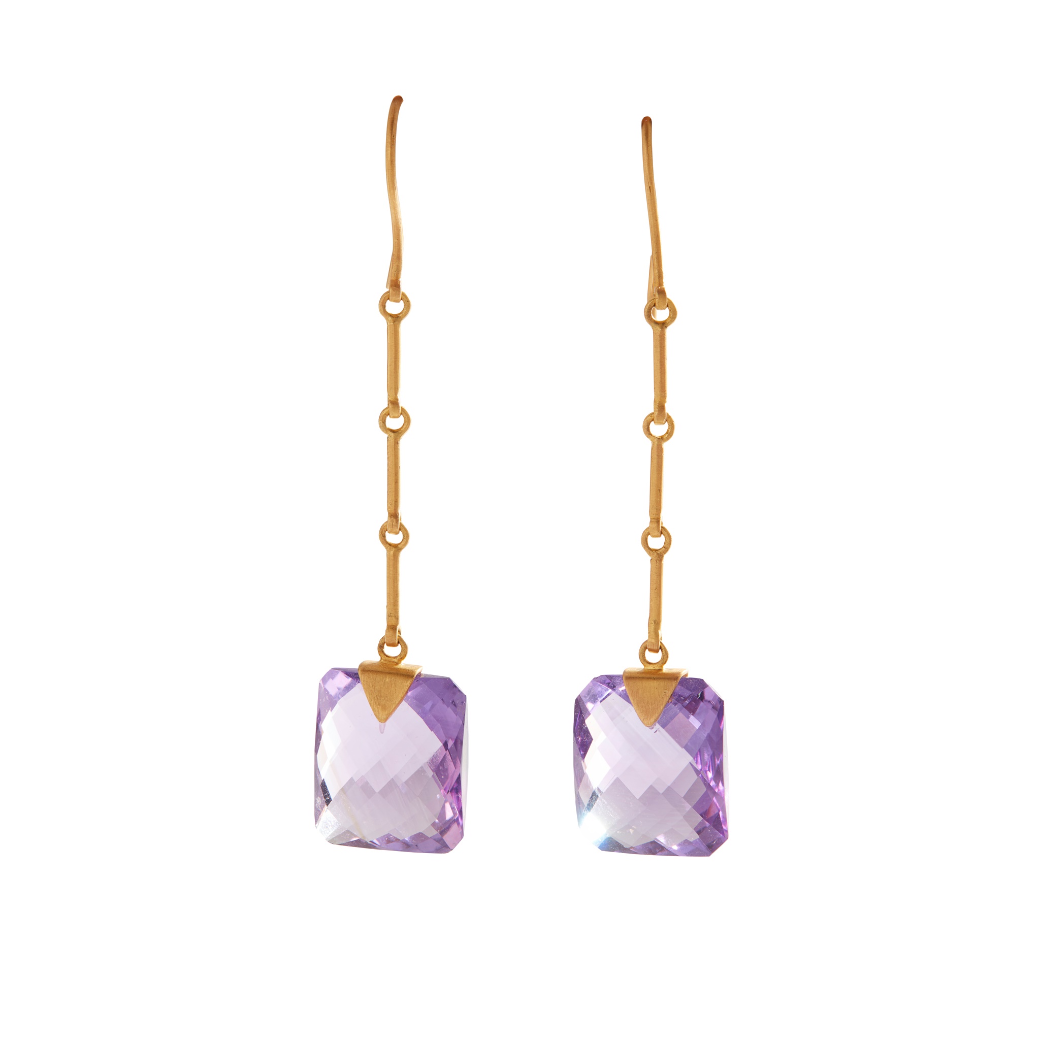 each composed of three bar links, suspending a faceted square amethyst drop, to hook fittings, modelled in 18ct gold