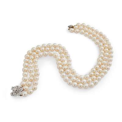 composed of three strands of cultured pearls, to a floral cluster clasp, set throughout with round brilliant and eight-cut diamonds, unmarked
