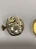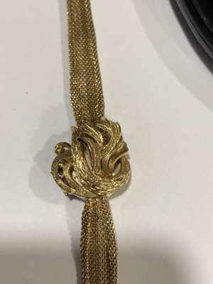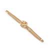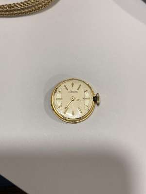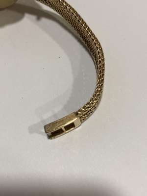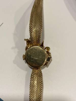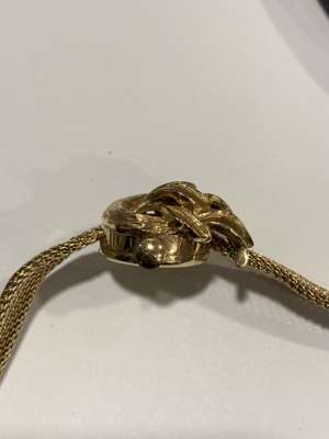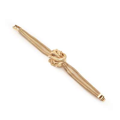with an ornate case cover, the dial with a darker section to each side, with applied gold baton hour marker, gold hands, on a mesh bracelet strap marked 14K to the clasp, no box and papers