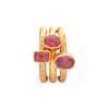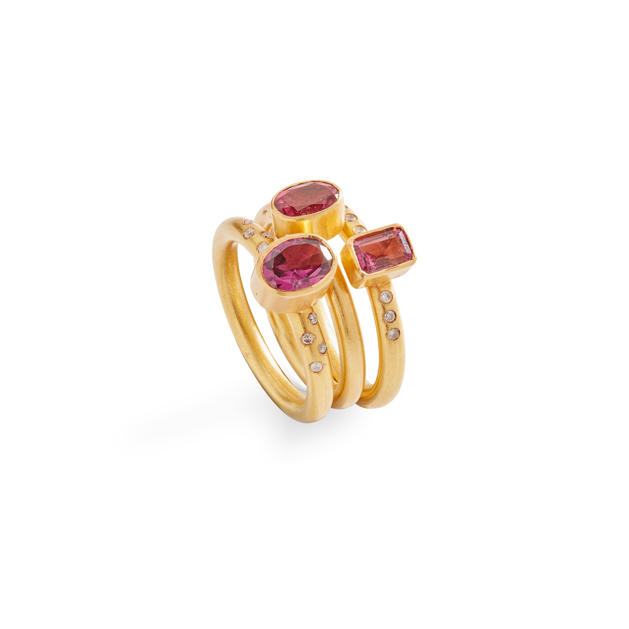 each collet-set with an oval or emerald-cut pink tourmaline, two rings with diamond set shoulders, modelled in 18ct or 22ct gold