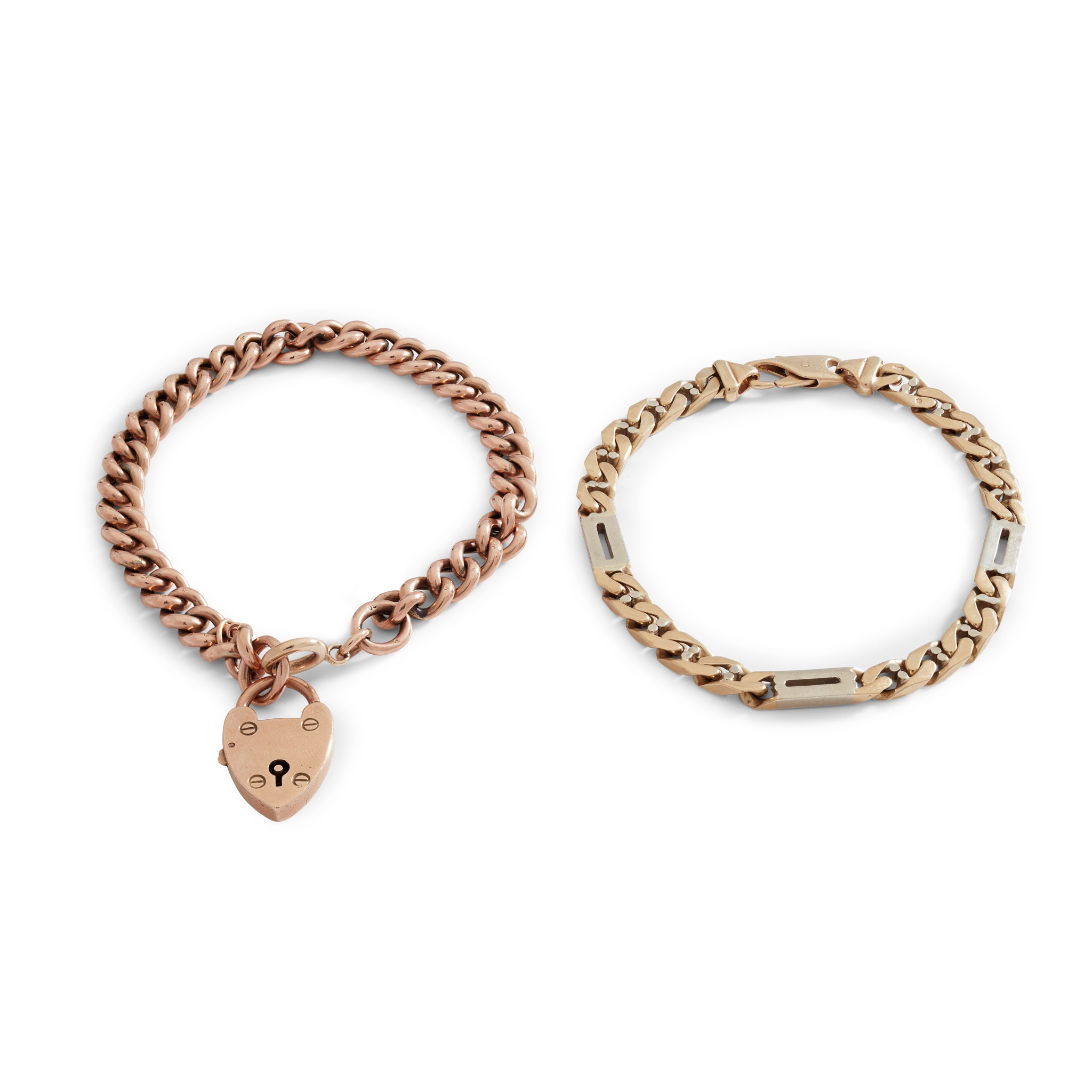 with padlock clasp; together with a 9ct bi-coloured gold flattened link bracelet