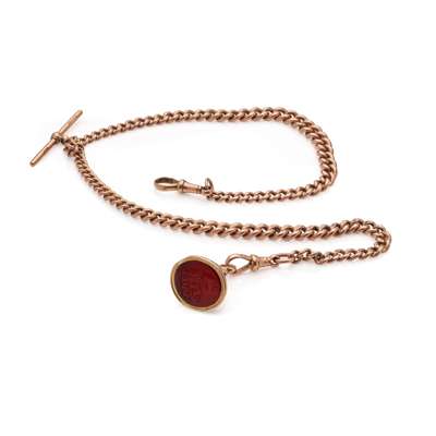 each formed by curb links, each marked 375, with T-bar and dog clip clasp, each with a gold-plated carnelian set fob