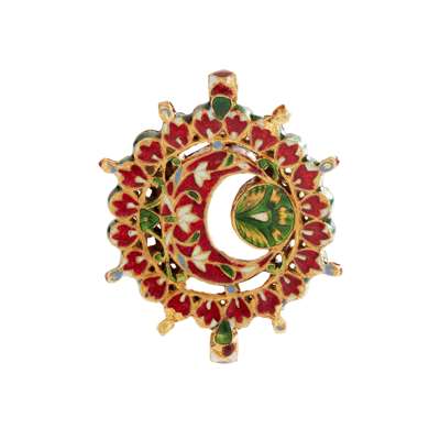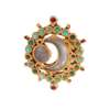 set with various turquoise, ruby and quartz in a sun and moon motif, enamel foliate decoration to reverse, unmarked