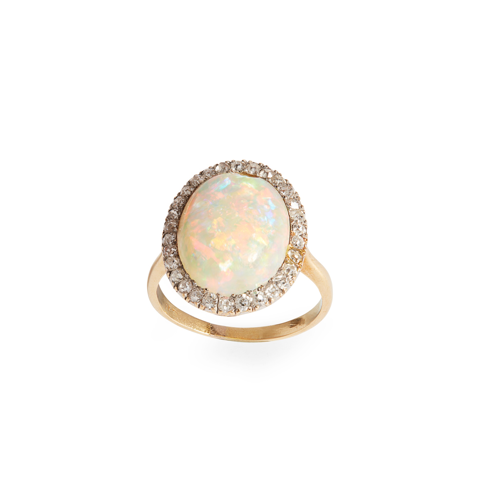 claw-set with an oval cabochon opal in a border of round-cut diamonds, to a plain band, stamped 18ct