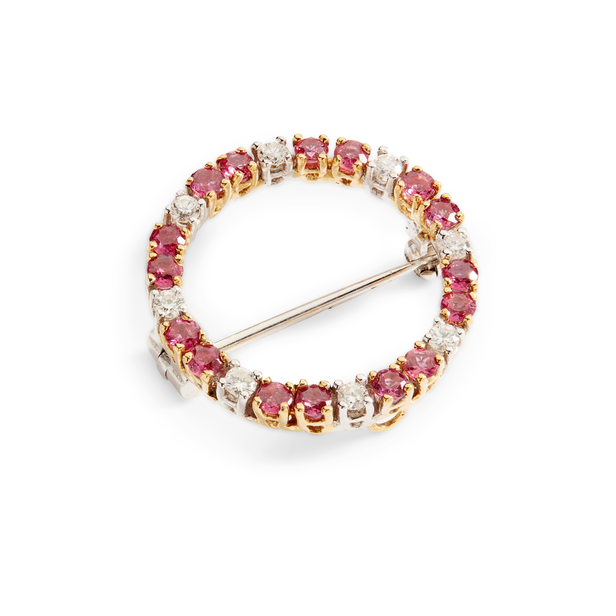 claw-set with round brilliant-cut diamonds and rubies, modelled in 18ct gold