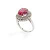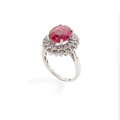 claw-set with a reddish-pink oval-cut tourmaline, in a double border of round brilliant-cut diamonds, to a plain shank, mounted in 18ct gold