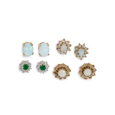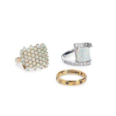 to include a pair of 18ct gold emerald and diamond set cluster earrings, a pair of opal and diamond cluster earrings, unmarked; two more pairs of opal earrings, unmarked; an 18ct gold sapphire and diamond eternity band, a large 9ct gold opal dress ring; and a synthetic opal and colourless gem-set ring, stamped 925