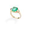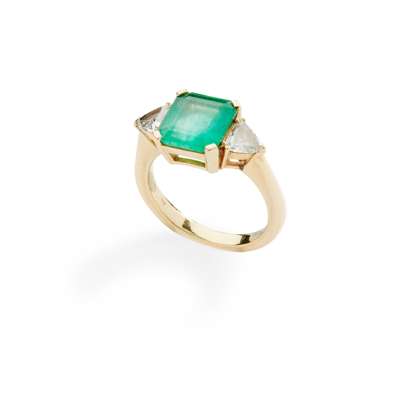 claw-set with a square emerald-cut emerald, flanked to either side by a trilliant-cut diamond, to a plain band, mounted in 18ct gold