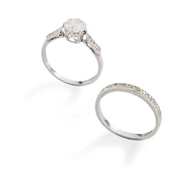 claw-set with an old round-cut diamond, each shoulder set with eight-cut diamonds, to a plain band, unmarked; together with a diamond-set half-eternity ring, stamped PLAT