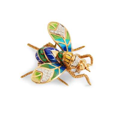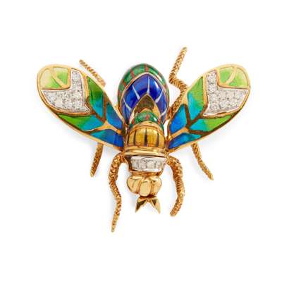 naturalistically modelled, the wings pavé-set with round brilliant-cut diamonds, with enamel decoration throughout, unmarked