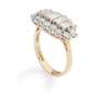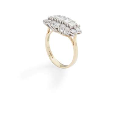 claw-set with five graduated baguette-cut diamonds in a border of round brilliant-cut diamonds, modelled in 18ct gold