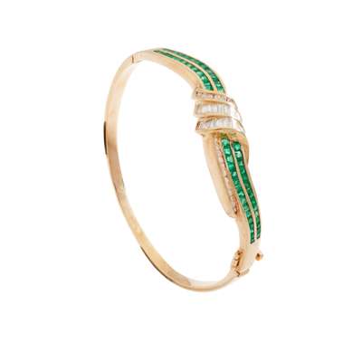 of hinged design, channel-set with two rows of square step-cut emeralds, with baguette and round brilliant-cut diamond detail, stamped 750