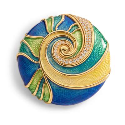 of circular outline, with blue, green and yellow guilloche enamel and a scrolling detail of pavé-set round brilliant-cut diamonds, modelled in 18ct gold