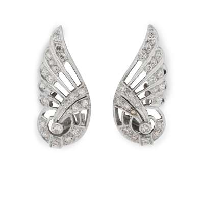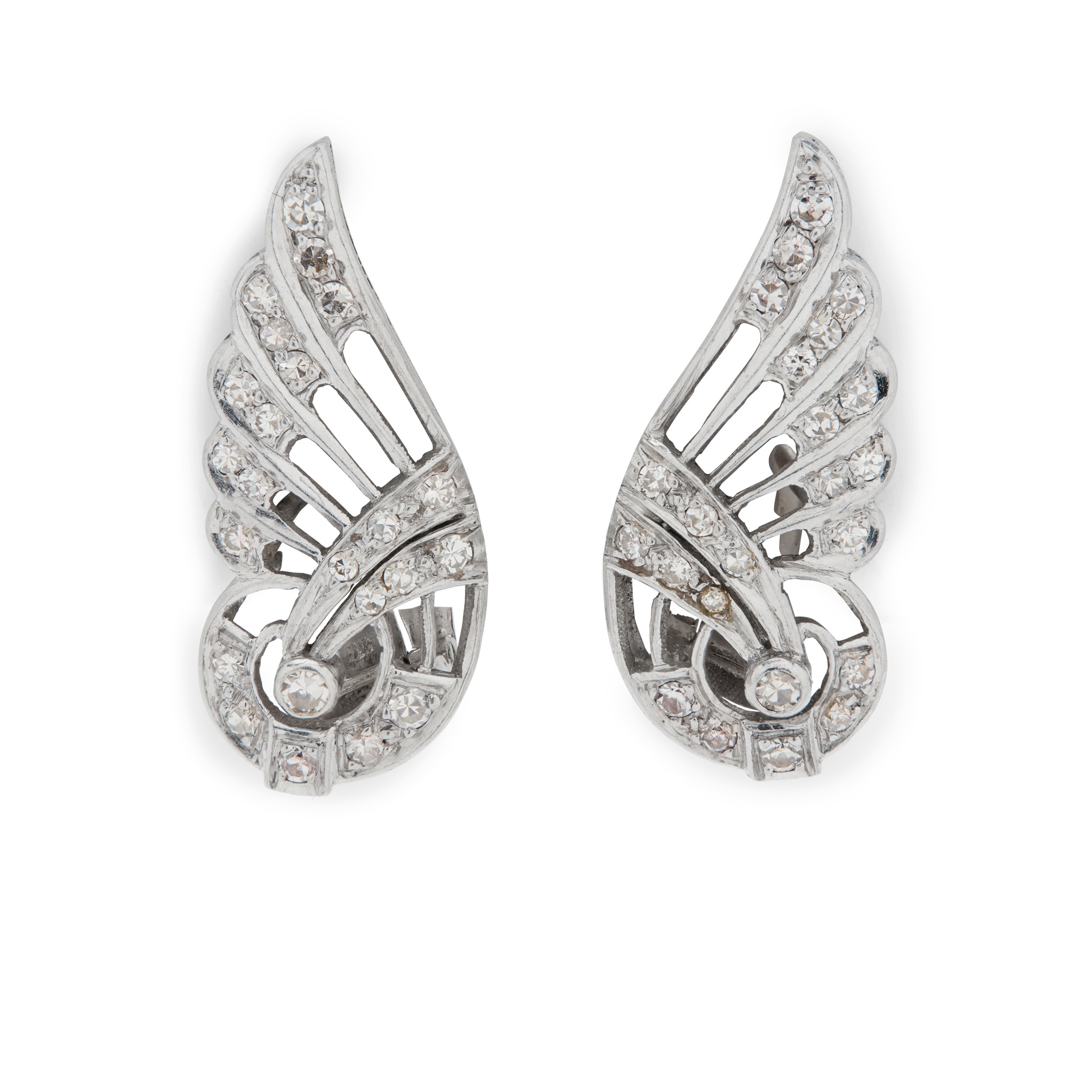 each of scrolling pierced design, set throughout with eight-cut diamonds, to post and clip fittings, unmarked