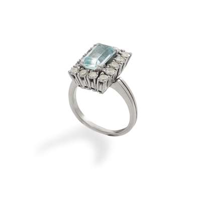 claw-set with an emerald-cut aquamarine, in a border of round brilliant-cut diamonds, unmarked