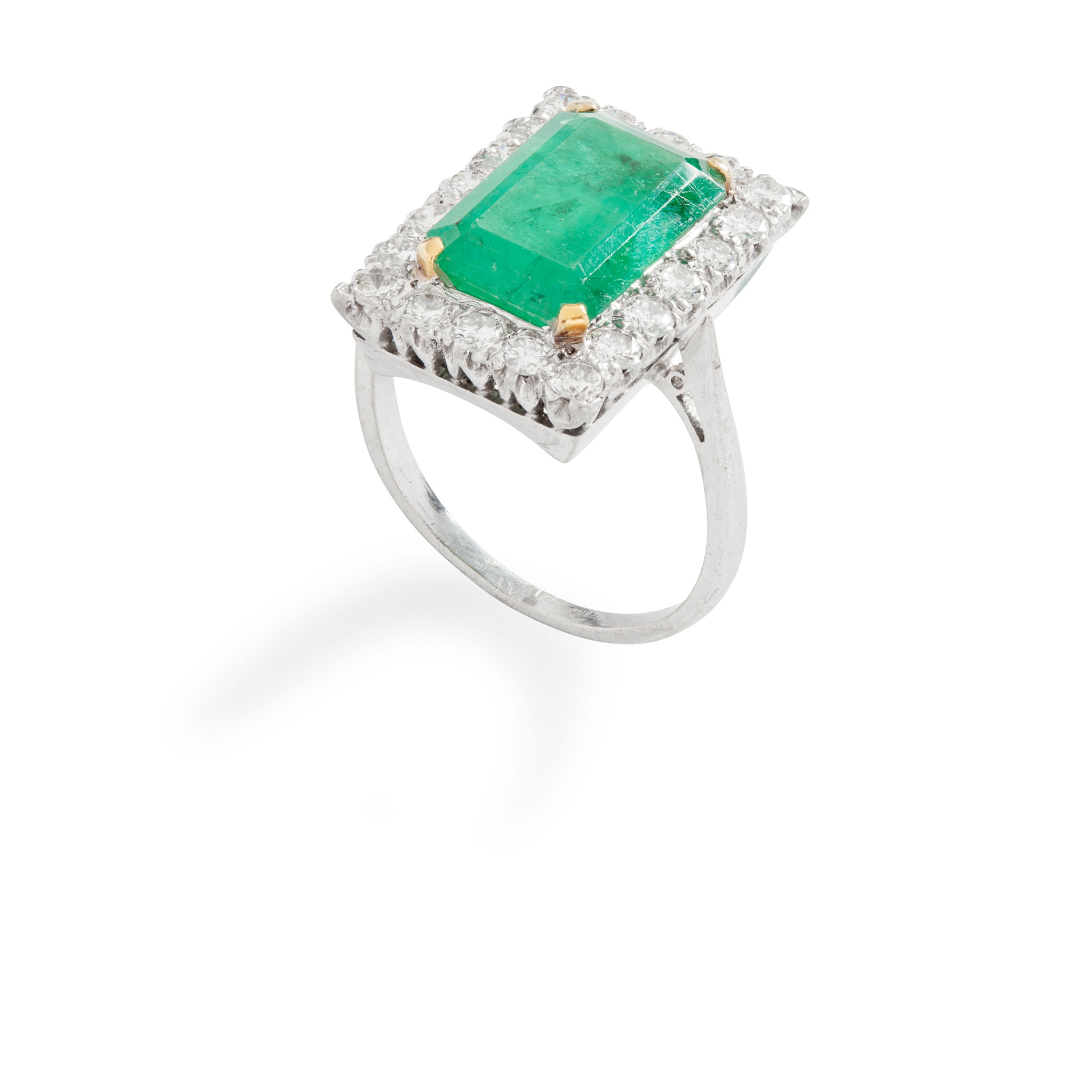 claw-set with an emerald-cut emerald in a border of round brilliant-cut diamonds, to a plain band, unmarked
