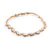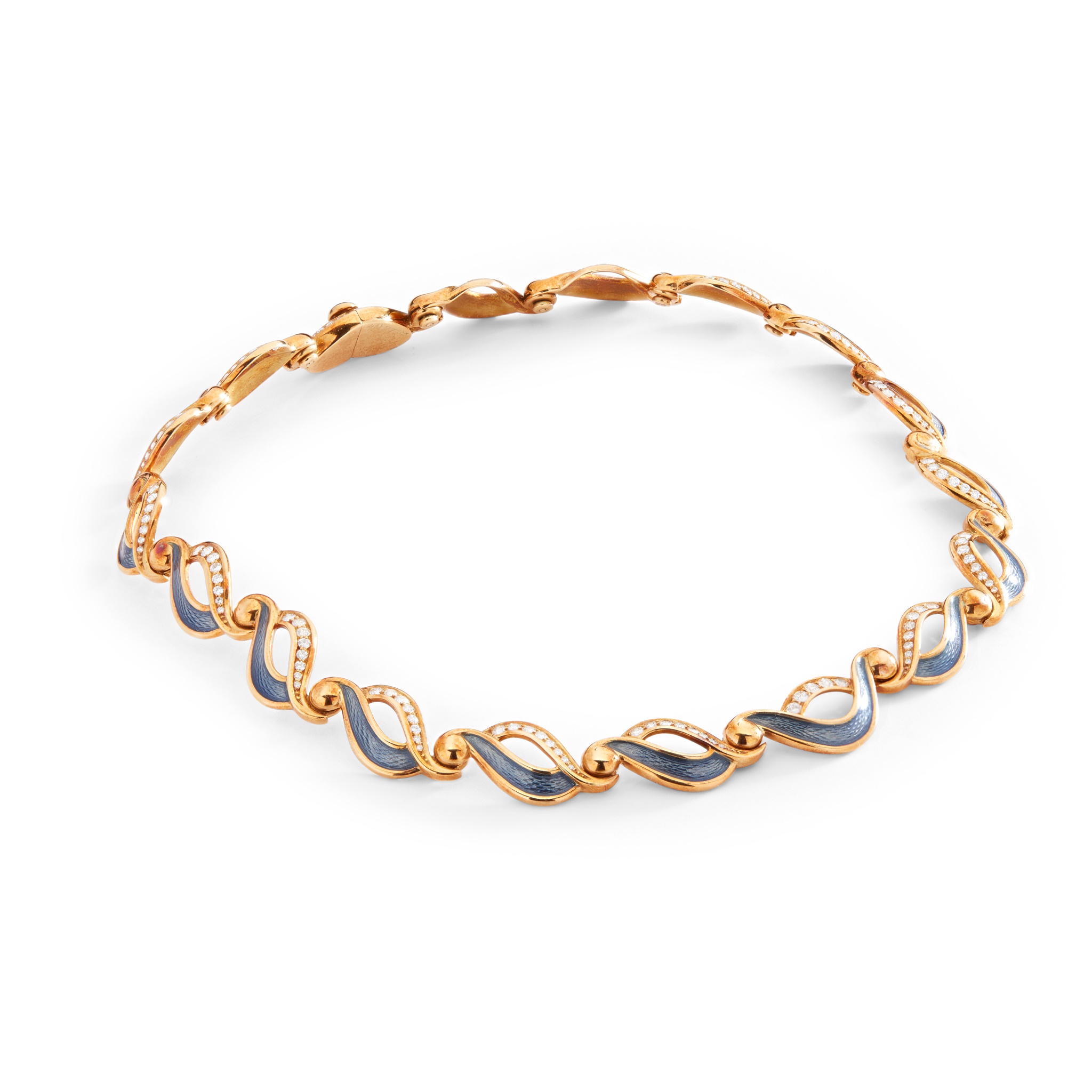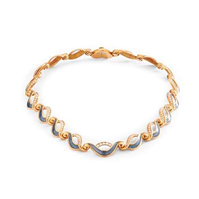 each curving link with blue guilloche enamel and graduated round brilliant-cut diamond detail, modelled in 18ct gold, signed de Vroomen
