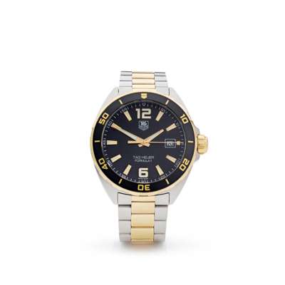 Formula 1 model WAZ1121, stainless steel case, quartz movement, round black dial with gold-bordered lume-filled hour markers, date aperture at 3, gold bezel with black insert with count-up scale in black, on a stainless steel bi-colour bracelet strap with signed TAG Heuer clasp, in box, with outer box, with booklet and guarantee card