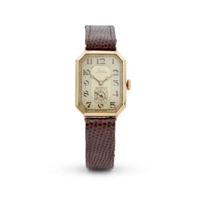 Marconi model, 9ct gold case, signed Rolex Marconi 15 jewel manual wind movement, signed octagonal dial with Arabic numerals in black, octagonal small seconds at 6, railroad outer seconds track in black, ornate black hands, with 824011, 916 to the case back, on a later strap, in box retailed by James Walker Ltd.